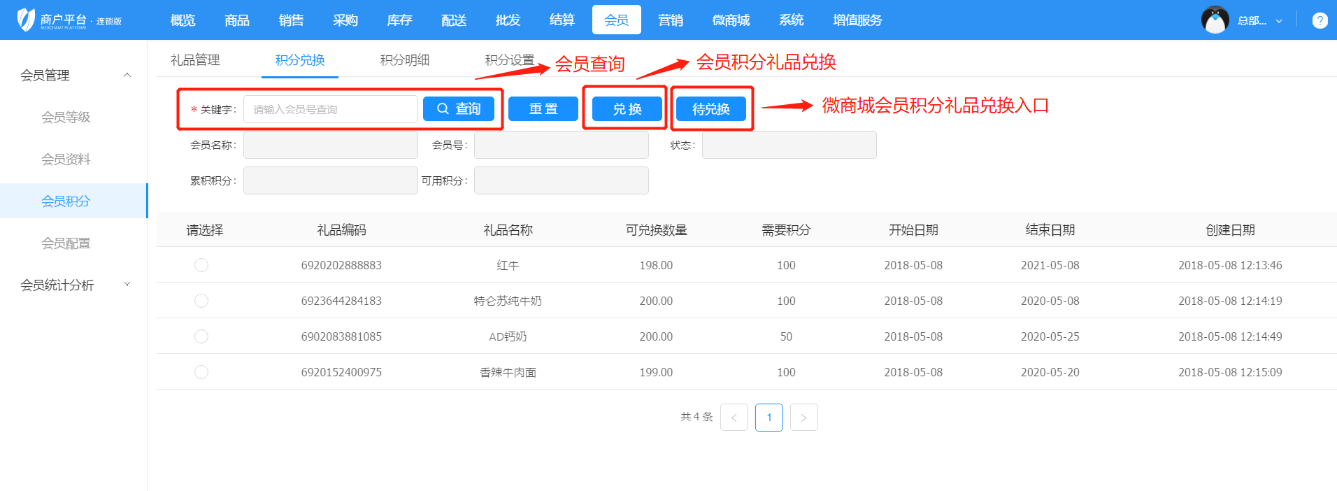 5)商戶可以在積分兌換界面為會員兌換設置的禮品,查詢會員信息后,積分足夠即可兌換。