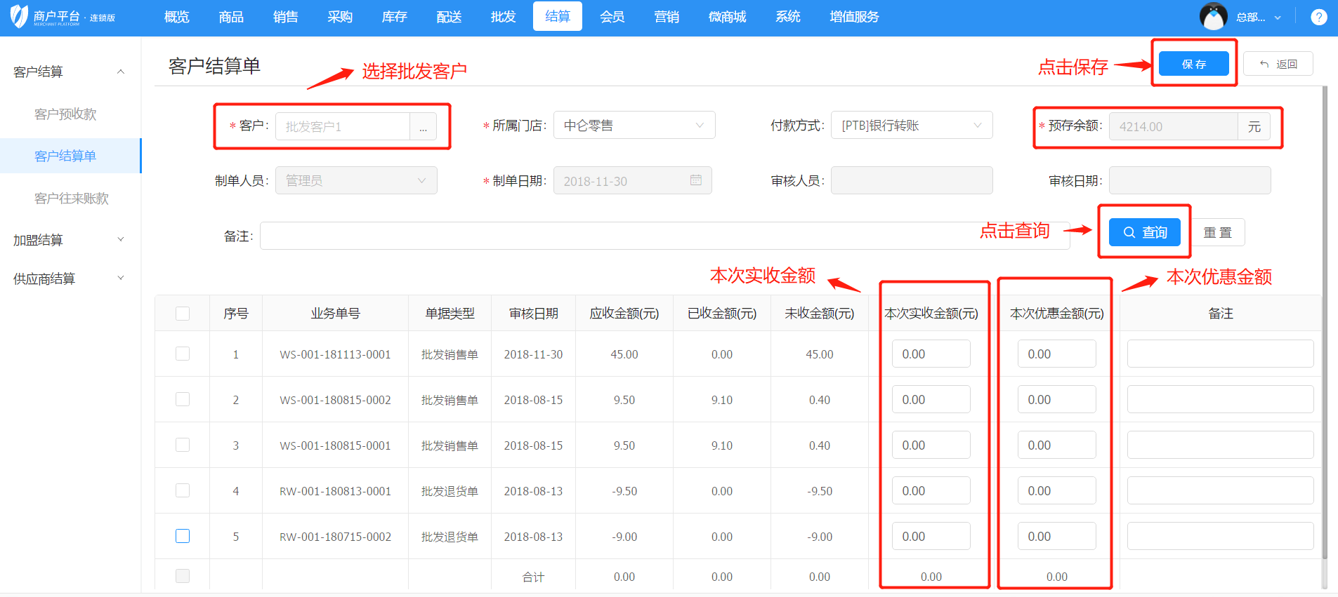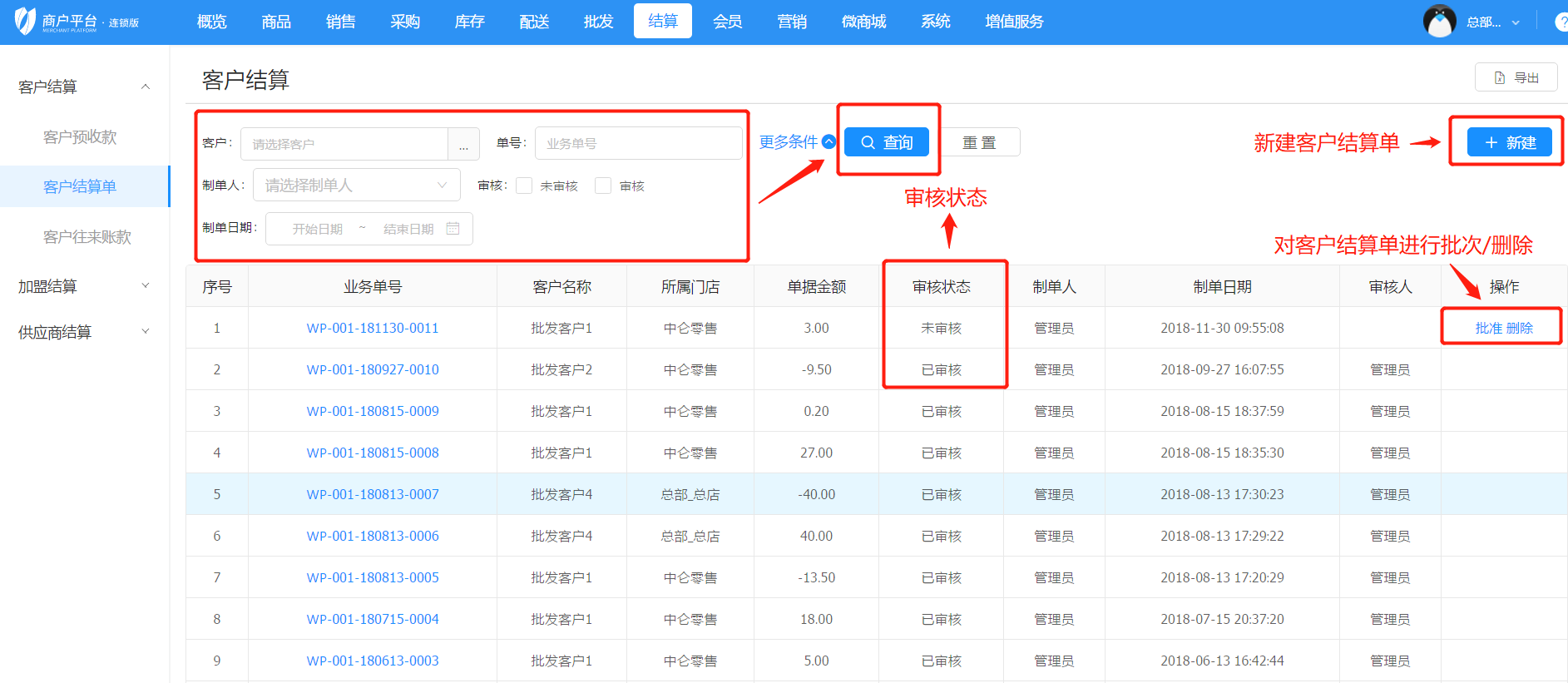 2)商戶在此界面對批發客戶的批發銷售單來進行統一的結算管理。