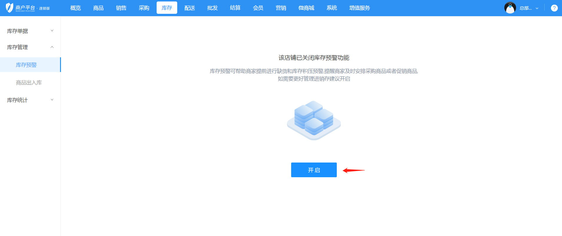 庫(kù)存預(yù)警未開(kāi)啟的可以點(diǎn)擊開(kāi)啟按鈕進(jìn)行開(kāi)啟。如要關(guān)閉庫(kù)存預(yù)警可以點(diǎn)擊關(guān)閉按鈕關(guān)閉。