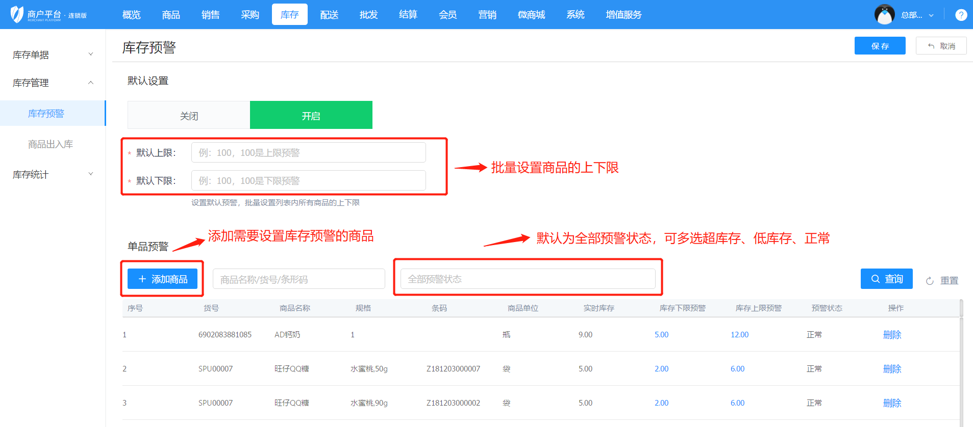 注:新建商品,在商品檔案處輸入庫(kù)存上下限的功能,庫(kù)存模塊的庫(kù)存預(yù)警會(huì)自動(dòng)開(kāi)啟。同時(shí)帶著商品檔案中填寫(xiě)的庫(kù)存上下限在庫(kù)存預(yù)警表中展示。并根據(jù)初始庫(kù)存確認(rèn)預(yù)警狀態(tài)。