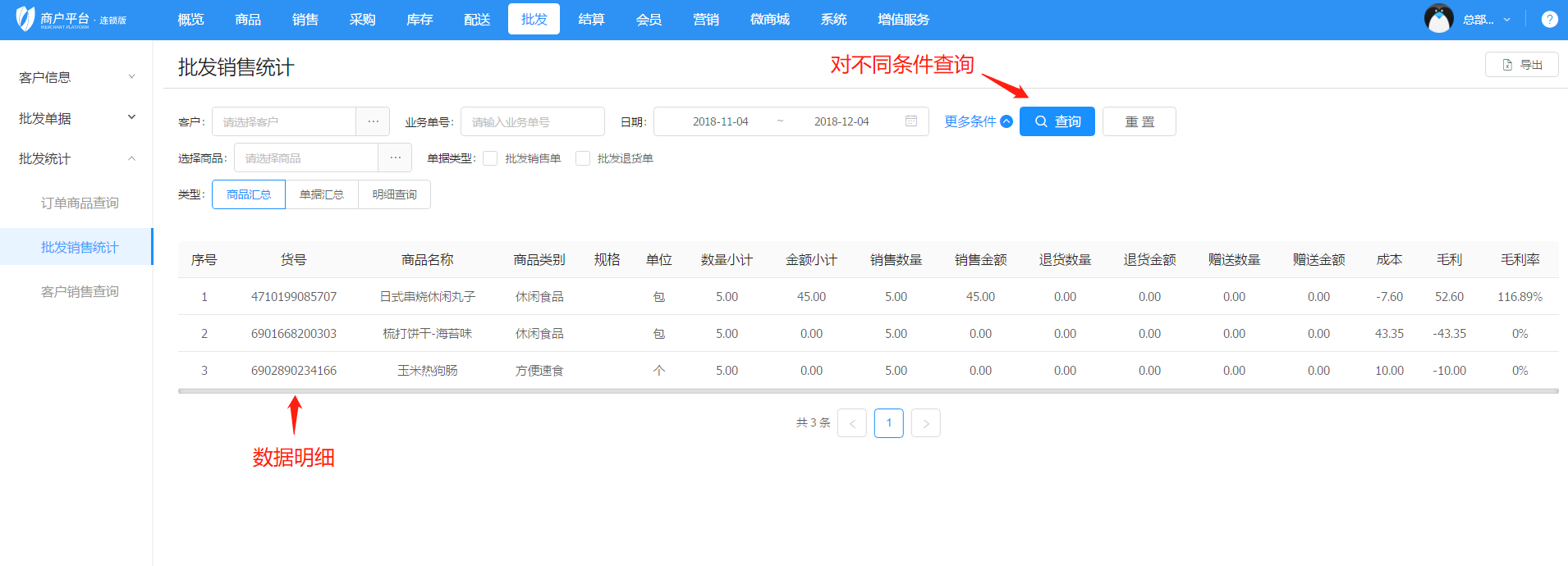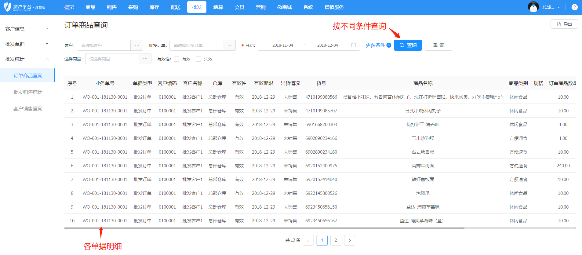 6)在批發統計界面,門店可以查看訂單商品查詢、批發銷售統計、客戶銷售查詢。