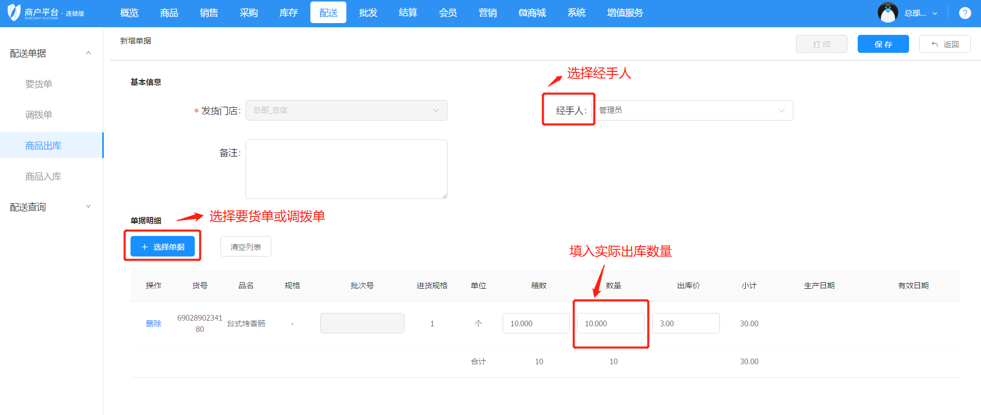 點擊【新建】,新增商品出庫單據(jù),選擇商品,輸入實際出庫的數(shù)量。