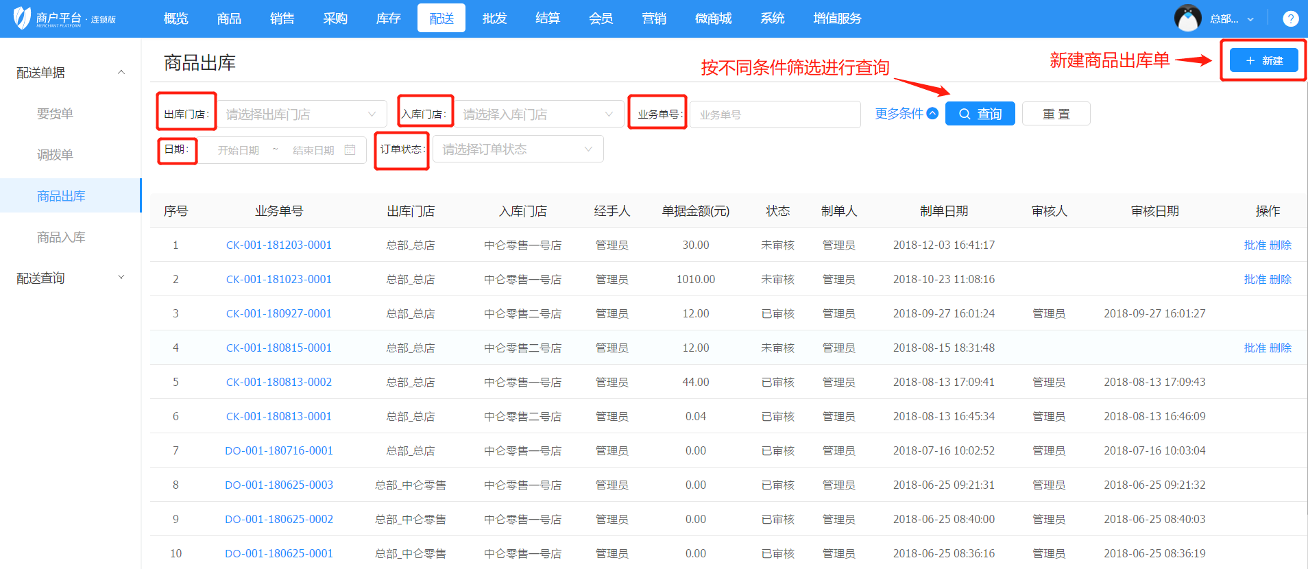 3)按照不同的門店顯示出庫的商品詳情,并可通過條件進行高級搜索。此項純粹的出入庫記錄,無相對應的銷售額。批準通過的商品會顯示已審核。