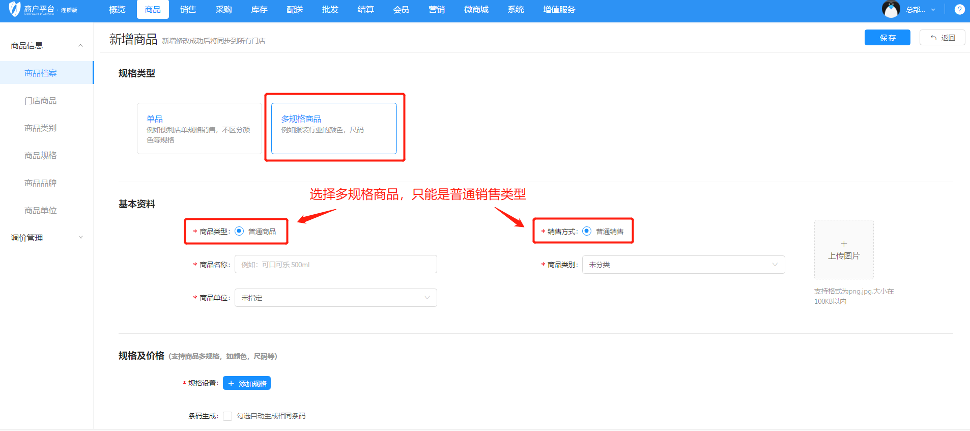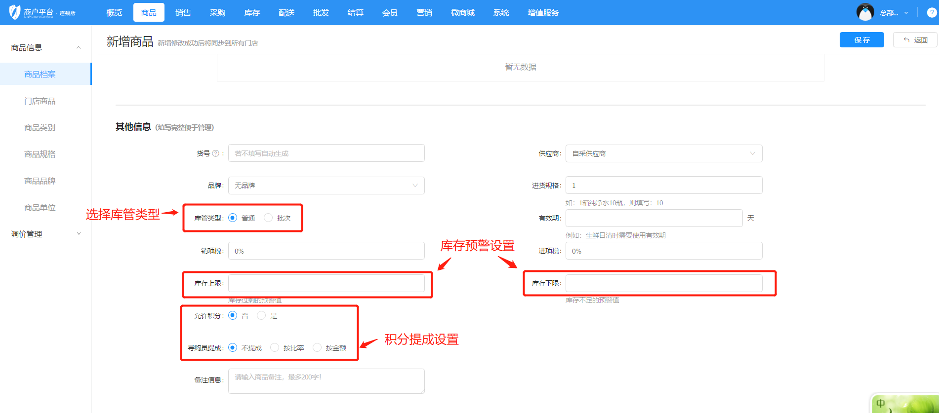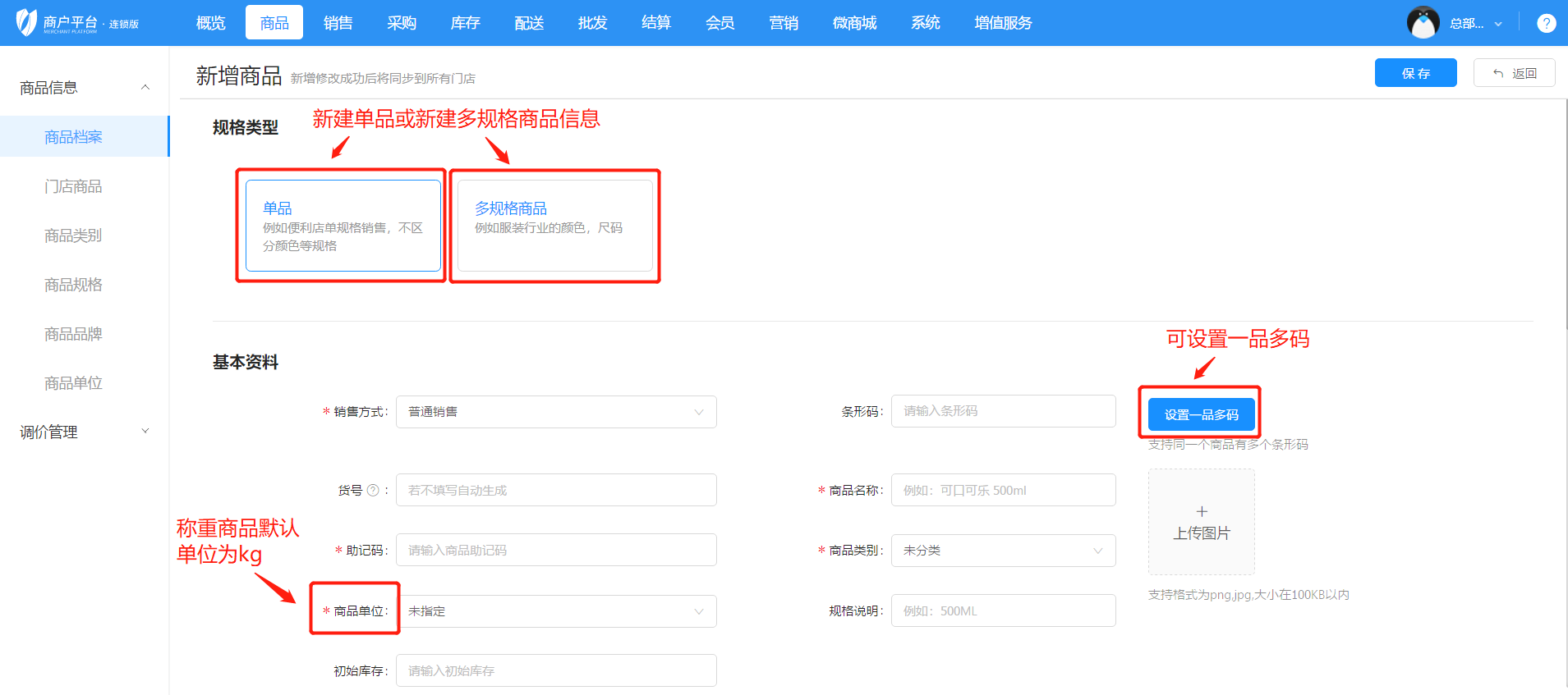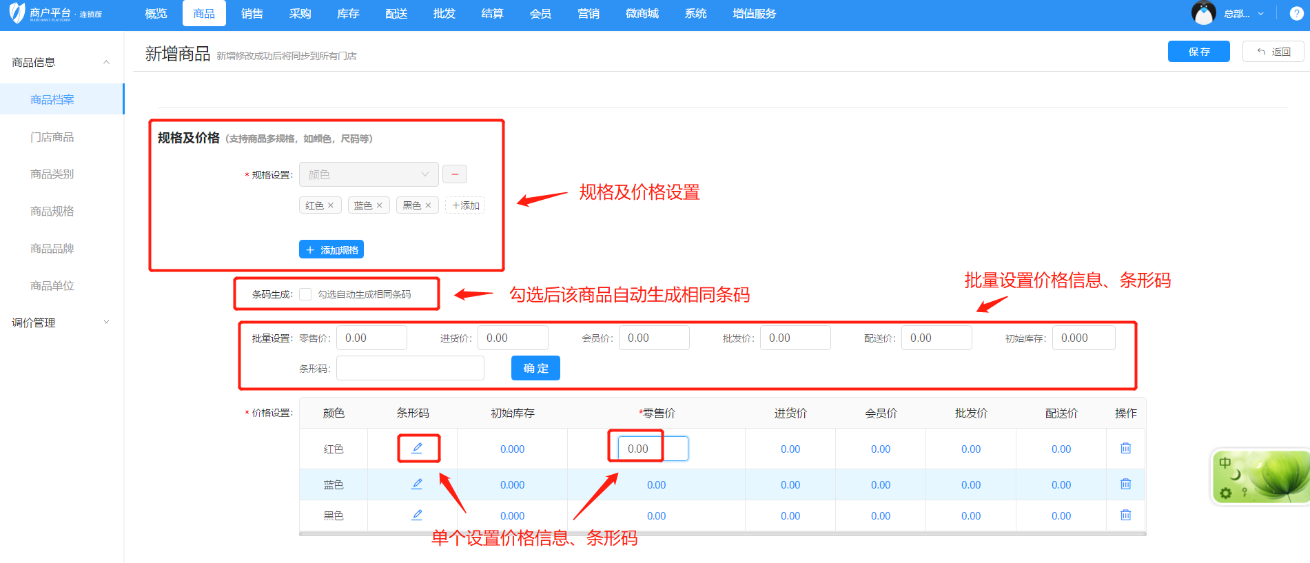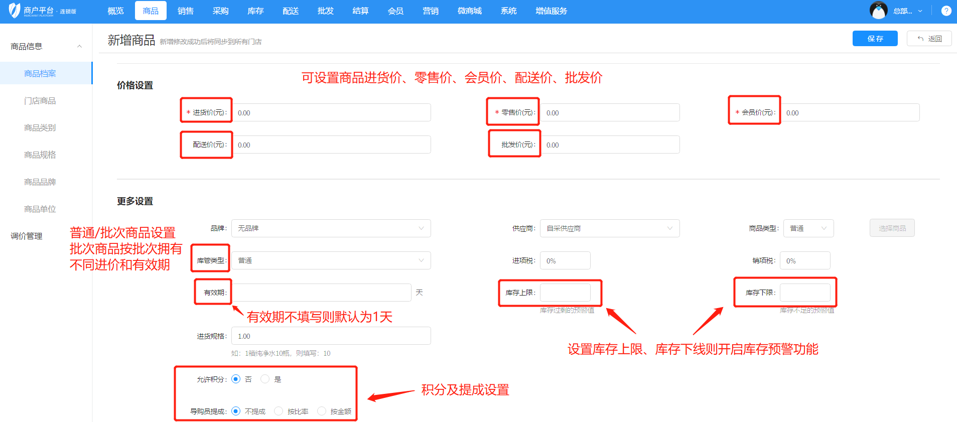 點(diǎn)擊【新建】按鈕,輸入商品基本資料、價(jià)格屬性等更多設(shè)置,完善的商品檔案是經(jīng)營管理的重要基礎(chǔ)。
