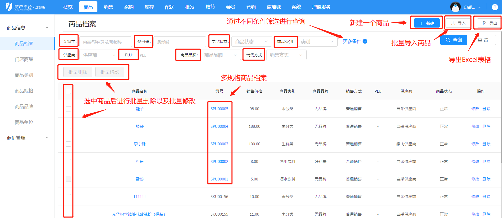 1)在商品檔案中可以對(duì)已有商品進(jìn)行不同條件的篩選查詢,并且支持新建、批量刪除、批量修改商品等操作。界面的右上角支持將商品檔案以“EXCEL”表格形式批量導(dǎo)出與導(dǎo)入。