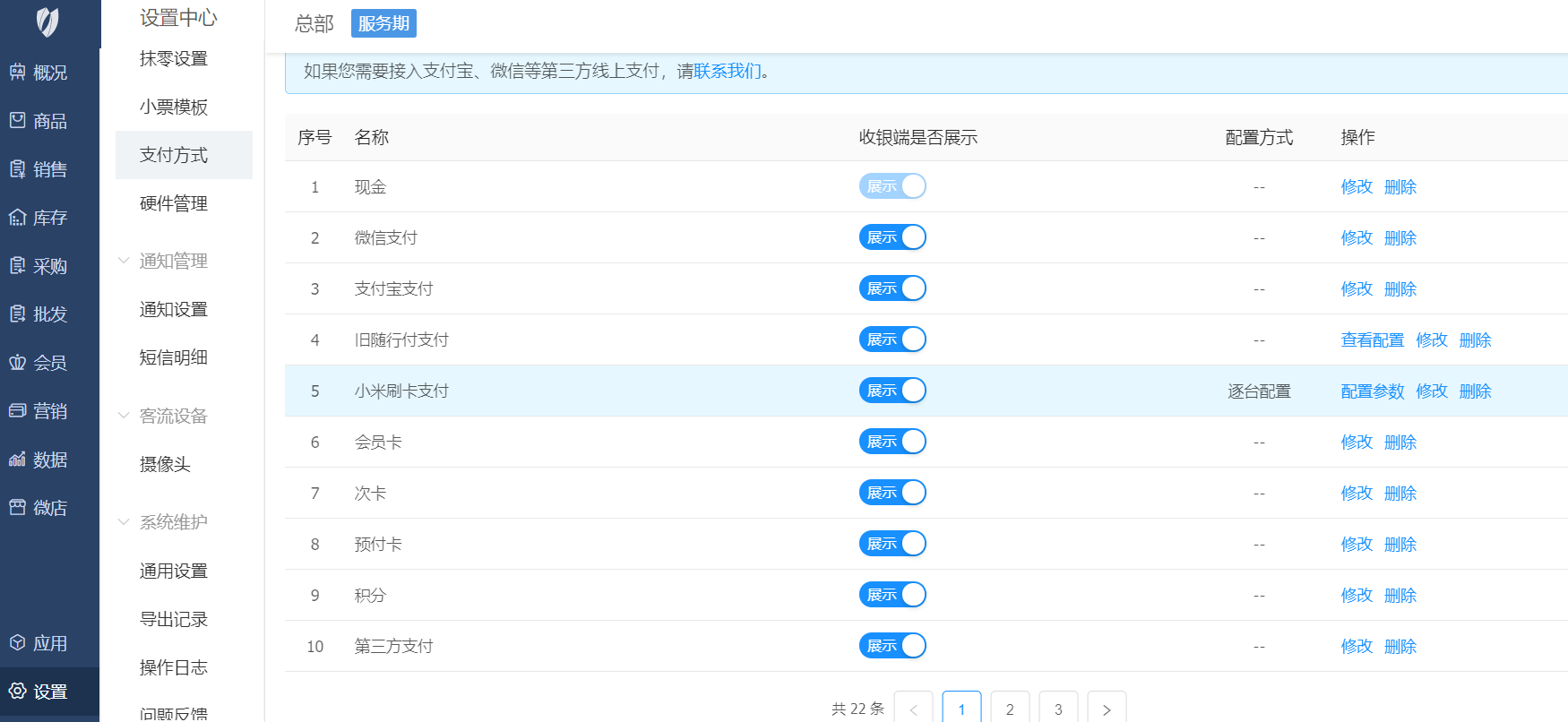 2、然后進入商戶后臺,找到設置,收銀設置,支付方式,找到對應的支付方式,將收銀端是否展示修改為展示。