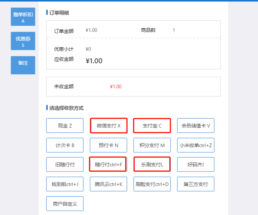 3、打開前臺收銀端,選擇商品加入購物車,選擇收款,選擇對應的支付方式(注意:官方支付是分開的,支付寶選擇支付寶,微信選擇微信;其他支付都是聚合的,直接選擇即可)