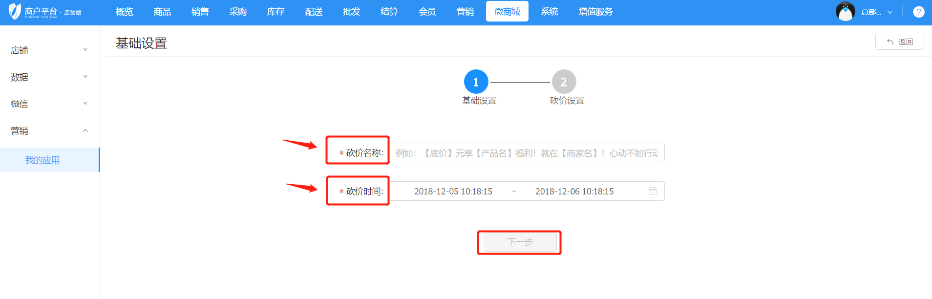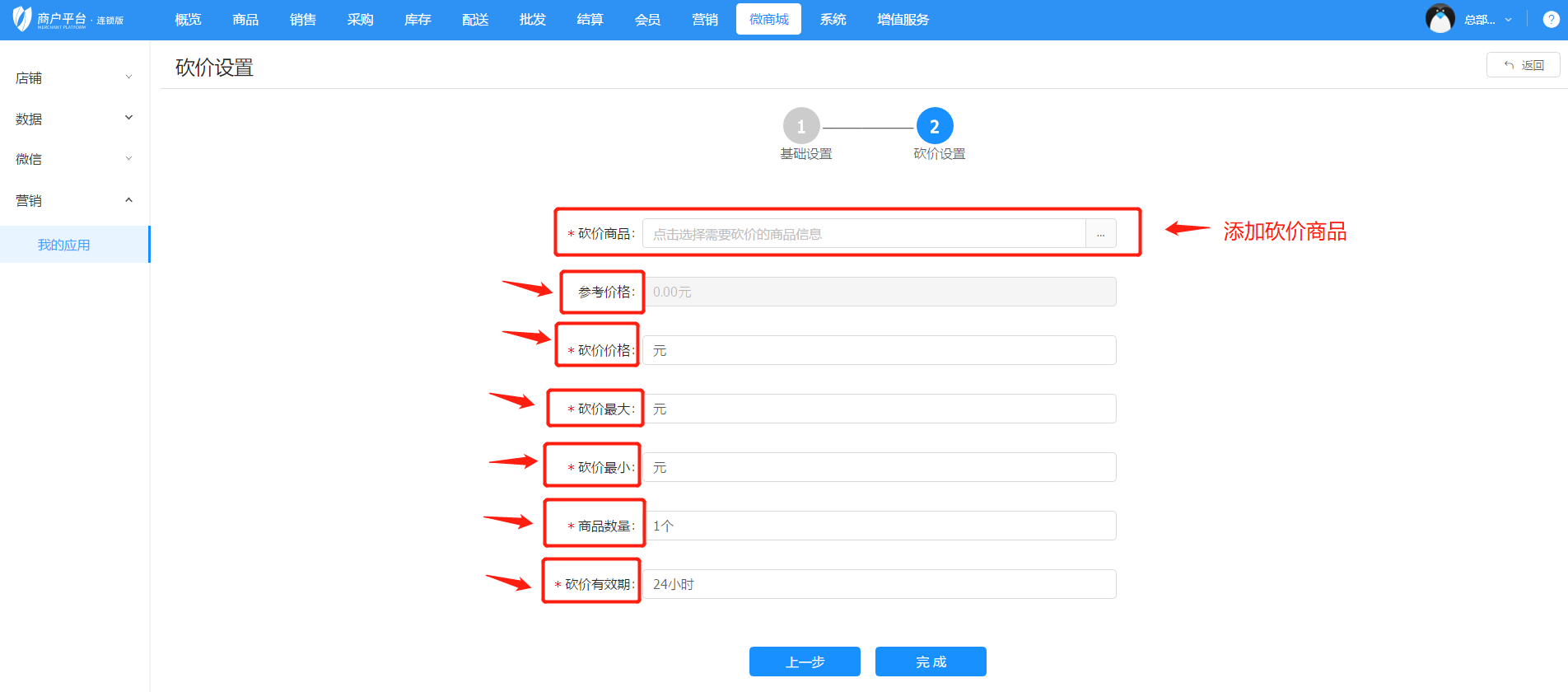 選擇添加可以砍價的商品、設置砍價最大金額、最小金額、商品數量、有效期,最后點擊完成即可。