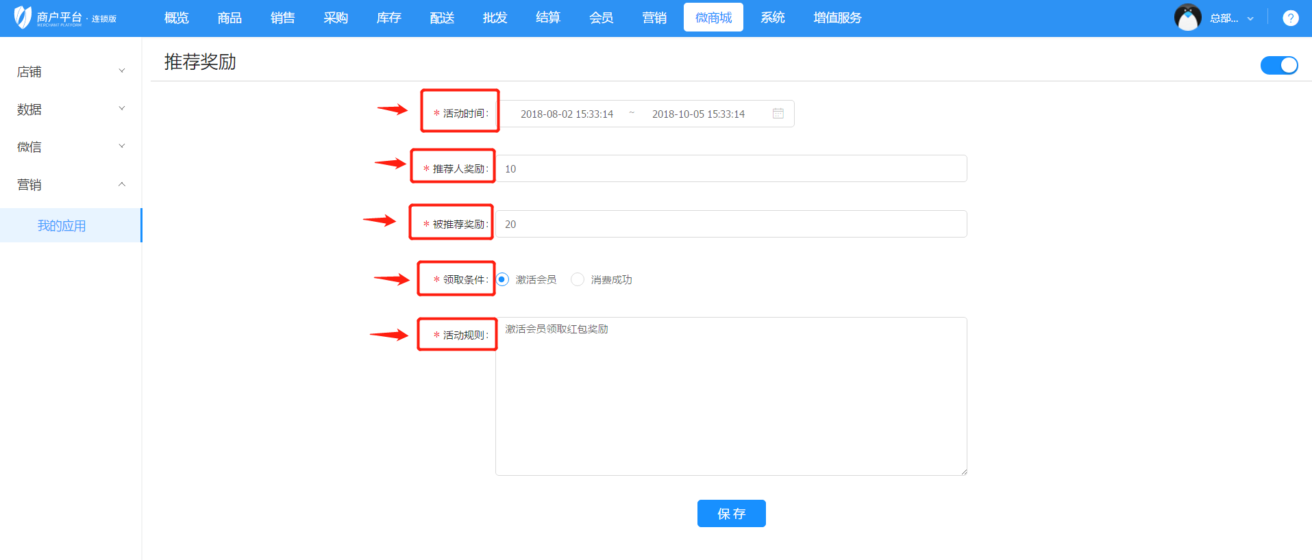 設置活動時間、推薦人獎勵、被推薦獎勵、領取條件(含激活會員、消費成功)和活動規則。