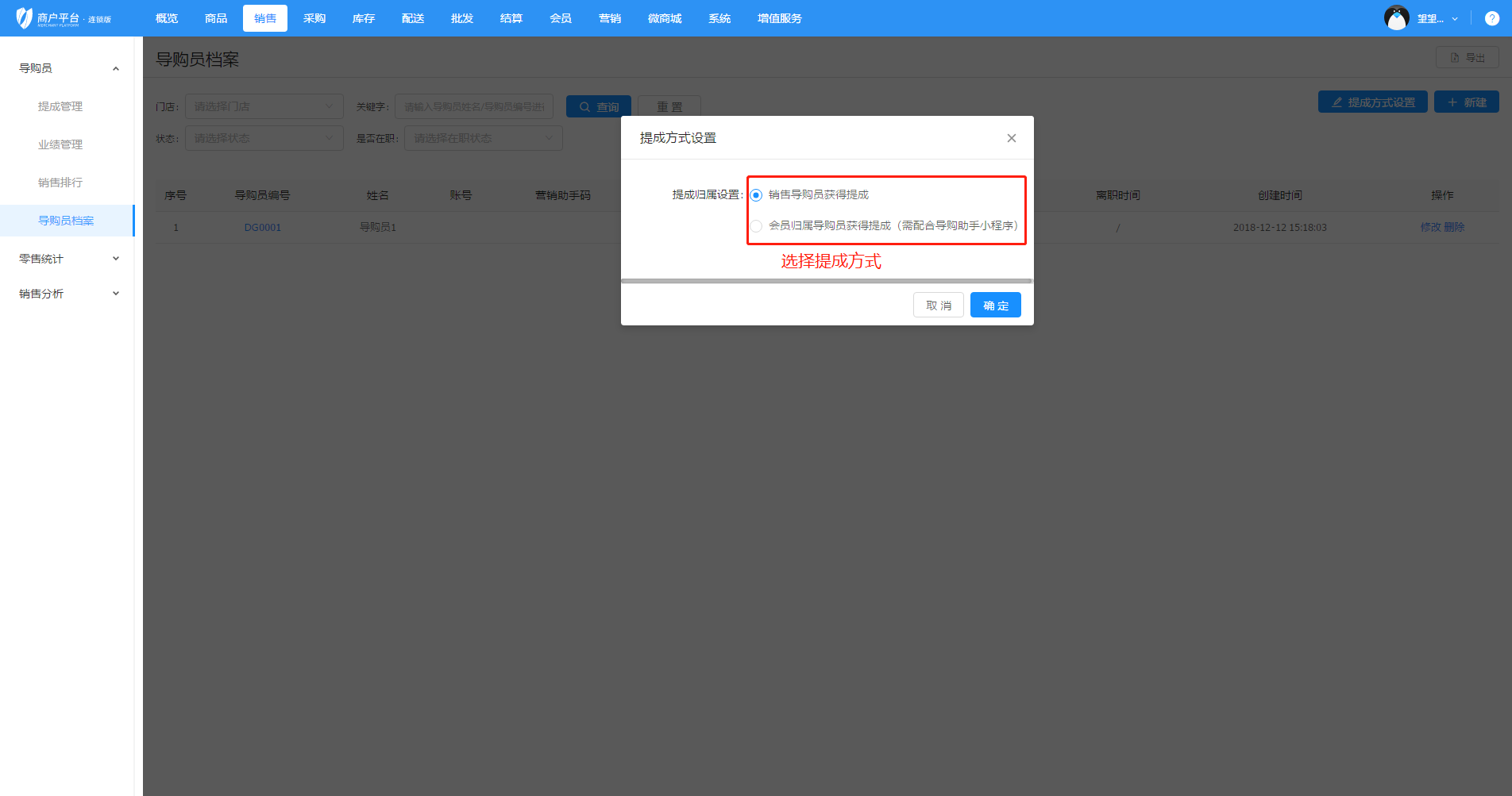 1. 后臺設置提成模式,可以選擇:銷售導購提成/會員導購提成