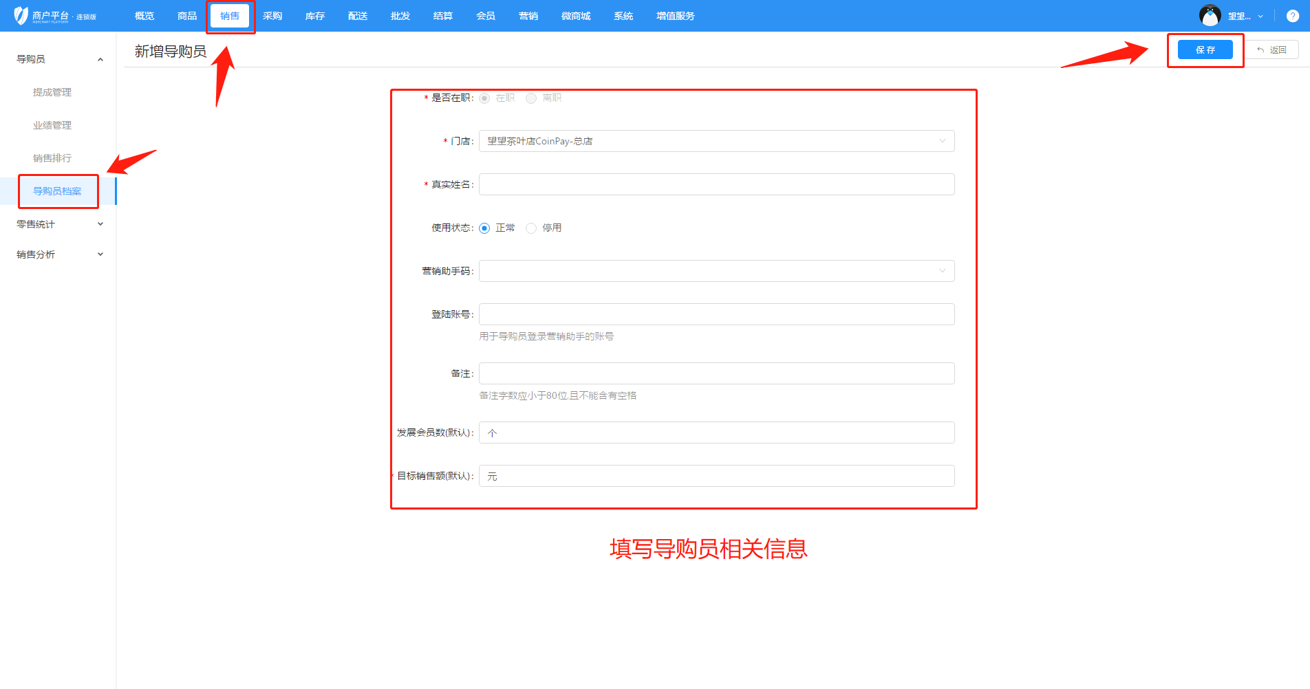 2. 后臺新增導購員,新增導購員路徑:銷售-導購員-導購員檔案-新建-保存