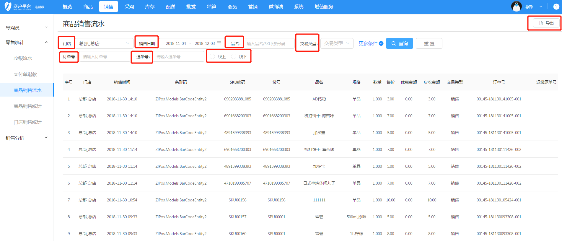 7)默認顯示今天的各商品銷售流水,可通過日期和和門店進行搜索。