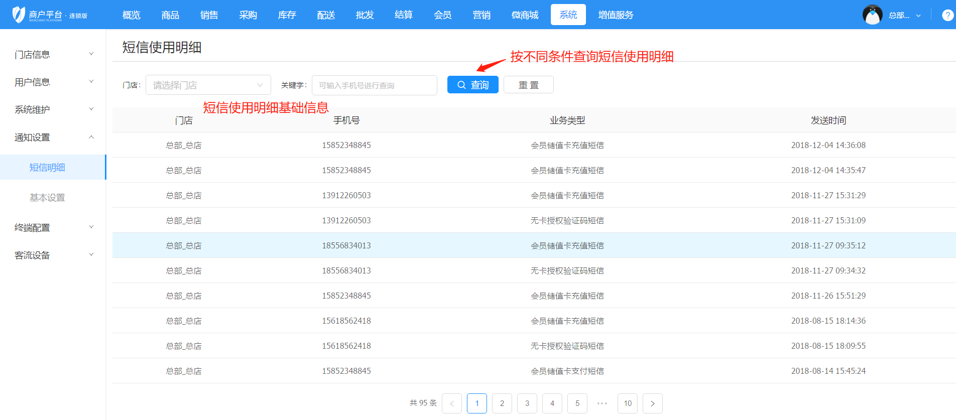 7)商戶可以通過短信使用明細看到詳細的往期的短信使用明細。