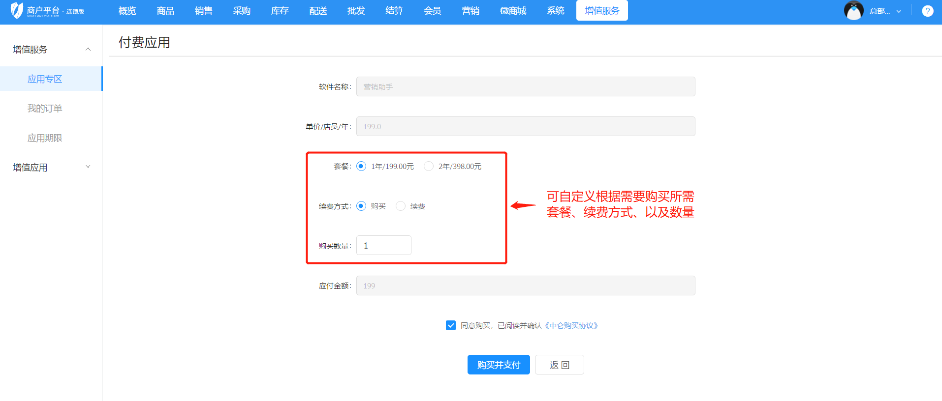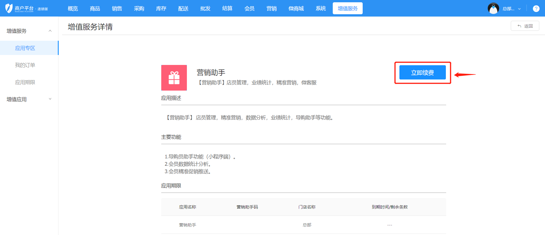 1)營銷助手,用于店員管理、業績統計、精準營銷、微客服。可自定義根據需要購買所需套餐、續費方式、以及數量。