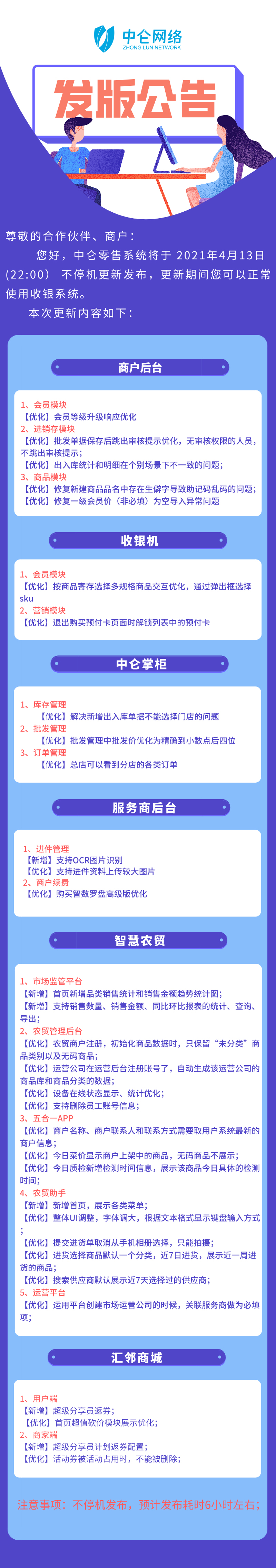 • 2020-11-2(00:00),中侖零售系統,商戶平臺更新內容如下: 閱讀次數:6952 發布日期:2021-11-24