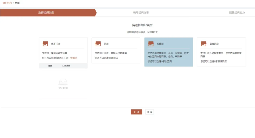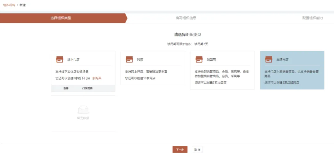 使用說明:點擊銀響力后臺進入【店鋪】,點擊【組織機構】選擇【新建組織】——【品牌網店】