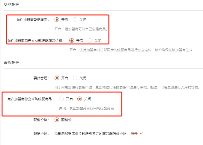 為了方便總部對加盟商的商品部署,在加盟商創建的時候就可以選擇數據來源。總部對加盟商是否可以自主新建商品、修改總部統配商品的價格、加盟商是否可以獨立采購總部商品都做了權限控制,更加方便靈活便于管理。開啟允許門店登記商品后,加盟店可以自主管理門店商品。通過這些新功能,我們旨在構建一個既規范又靈活的加盟體系,讓總部和加盟商之間形成更加緊密、高效的合作關系,共同推動品牌的發展和市場的拓展。
