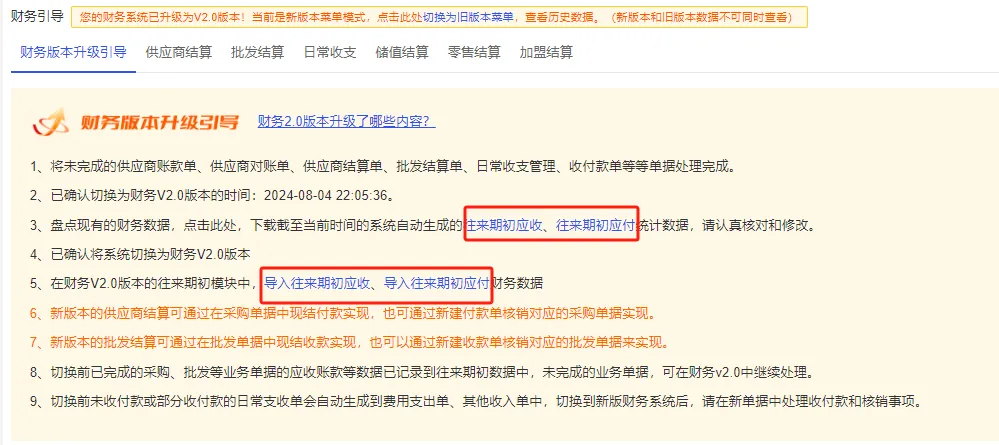 本次財務2.0版本升級后采購、批發、促銷扣補單、賬款單等單據,已完結但未完成付款的單據,付款狀態會變成“已轉期初”這些單據的數據,含在往來期初的數據中了,未完結的單據,可以在財務V2.0中繼續結算。在往來期初中進行導入也可以在升級引導中導入期初的賬款單據。往來期初應收對應的是批發單據,往來期初應付對應的是采購單據。單據導入以后可以通過付款單和收款單進行單據的核銷。