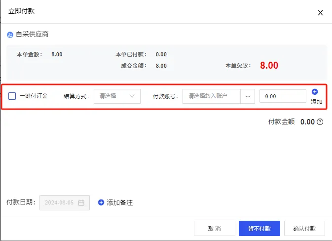 在2.0版本中,商戶在創建采購訂單時,可以便捷地通過一鍵操作支付訂金。