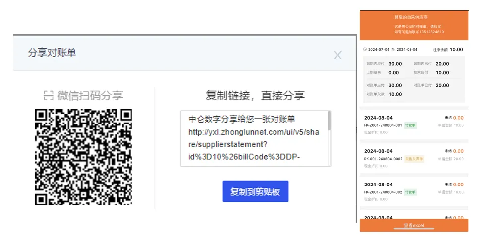 在財務2.0版本升級后,商戶在進行供應商對賬單操作時,現在可以更加方便地與供應商共享賬單信息。具體來說,商戶可以通過系統的功能一鍵分享賬單給供應商,使供應商能夠實時了解付款記錄和財務狀況,確保雙方的賬目清晰準確 。這種改進不僅優化了用戶體驗,也加強了供應鏈中的財務管理流程。