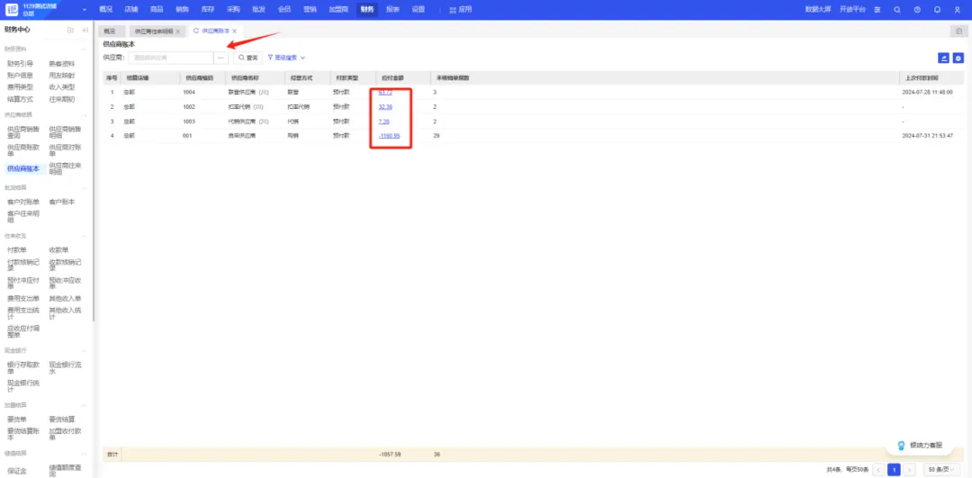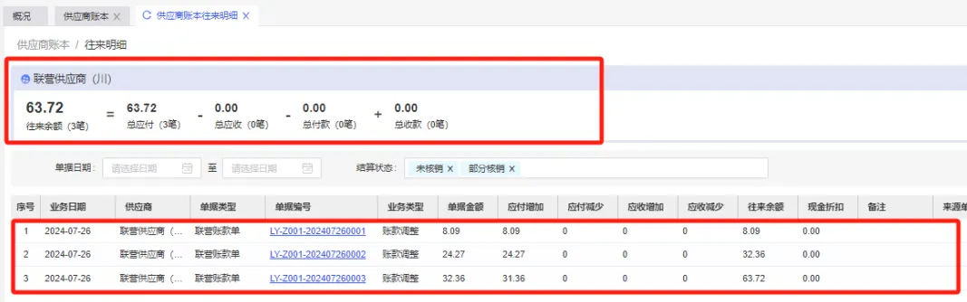 明細查詢:點擊應付金額,系統將直接跳轉到往來明細頁面,提供詳細的往來余額和單據信息。