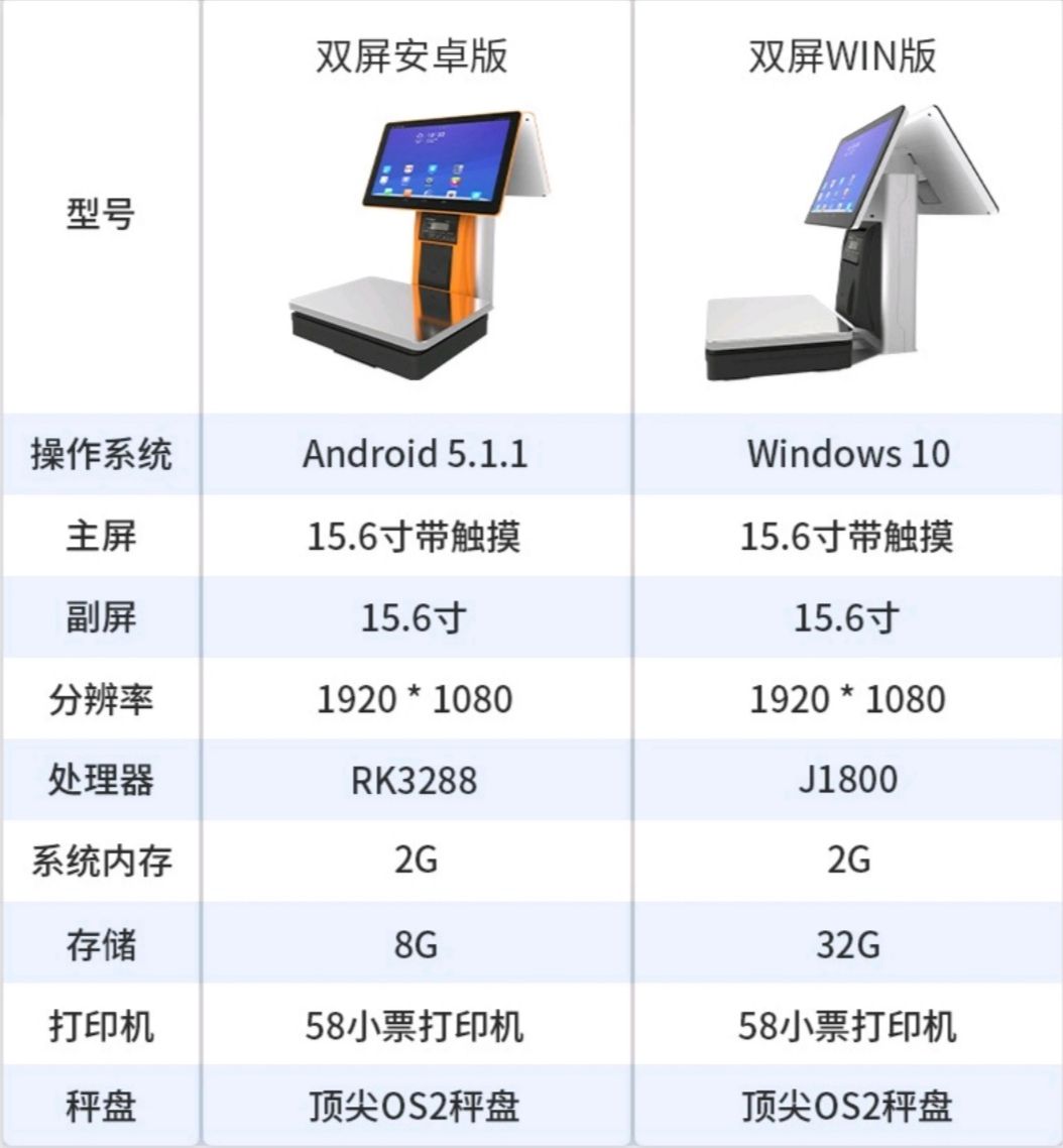 中侖智能收銀一體秤可分為windows系統和安卓系統兩個版本,兩個版本區別不大,主要依據自己的需要選擇購買,同樣都是15.6寸觸摸屏、含有58小票打印機、頂尖OS2防腐蝕秤盤,區別于windows系統內存為2+32G,而安卓系統內存略小一些,為2+8G,可選擇使用中侖SAAS系統收銀軟件,數據存儲在云端。