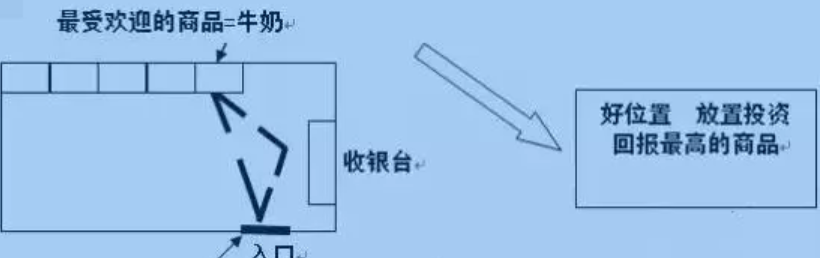 1)店內金三角——定位原則,它們在沿著三個要點的路徑上:入口,收銀臺,店內被最頻繁購買的商品周圍。