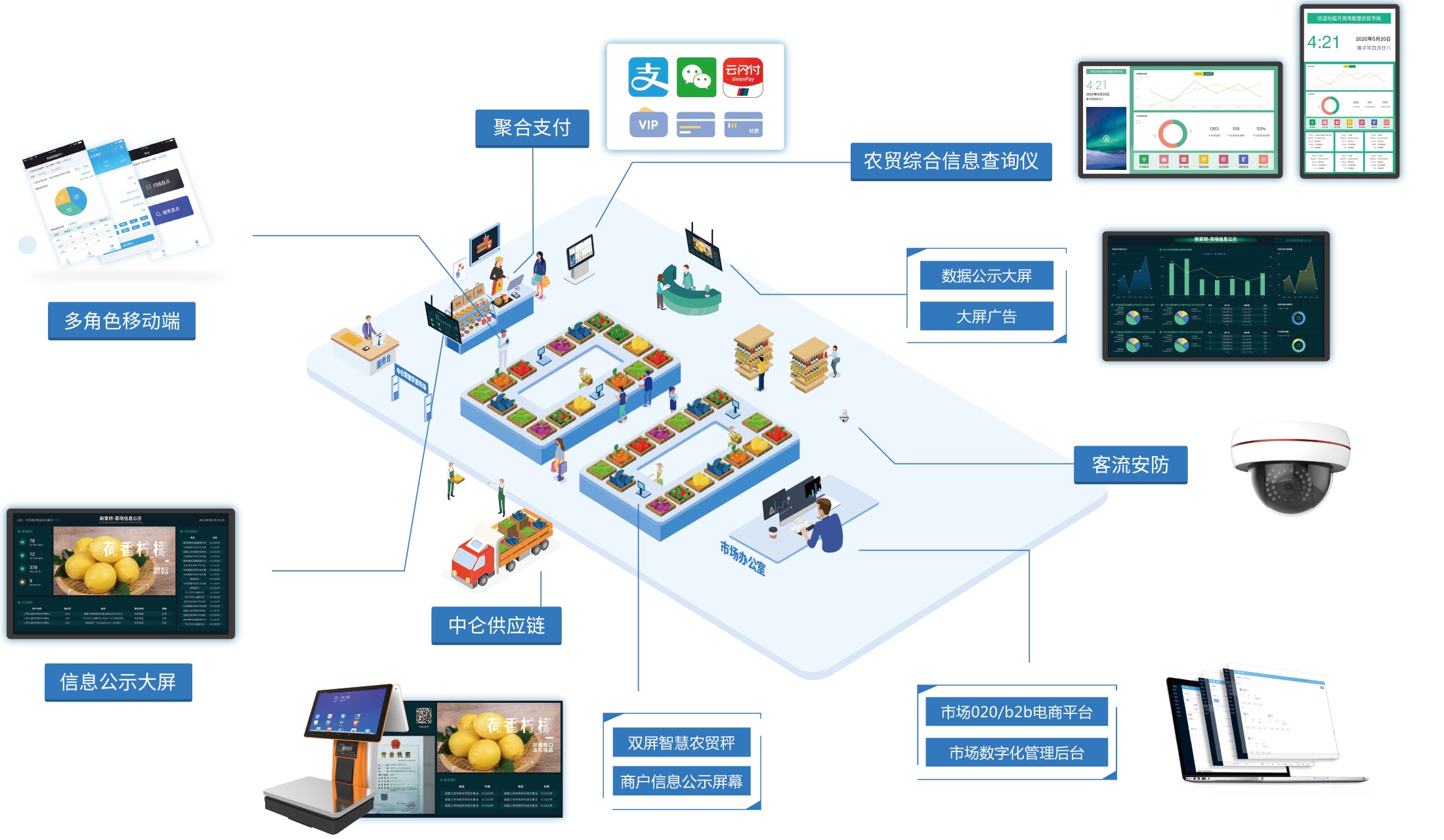 在很多人的印象中,菜市場是一個臟亂差的地方,污水遍地,東西雜亂,買菜稱重甚至有的老板會缺斤少兩,總之菜場體驗很差,很多年輕人都不愿意去菜市場買菜,加之,近幾年,連鎖生鮮超市的快速發展,菜市場經營更是每況愈下,越來越多的人選擇生鮮超市一站式采購日常生活所需,傳統菜市場亟需改變目前的現狀為自己的贏得生存空間,同時各地政府也在大力推進傳統菜市場的改造,在這樣的情況下,中侖智慧菜場解決方案應運而生,為傳統菜市場提供一站式的改造方案。