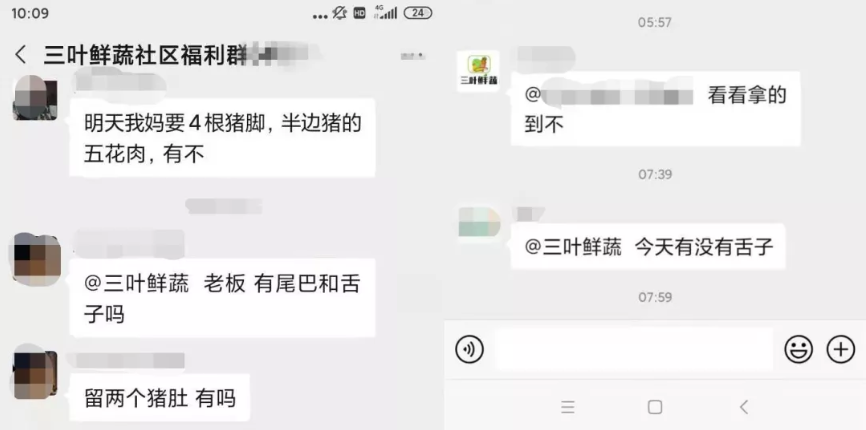 流量有了以后,三葉鮮蔬是這么運營的:告訴顧客,一些店里緊俏的肉類可以在社群預定,群里也會經常發一些美食制作視頻,紅燒豬蹄、酸菜魚等家常菜往群里發。