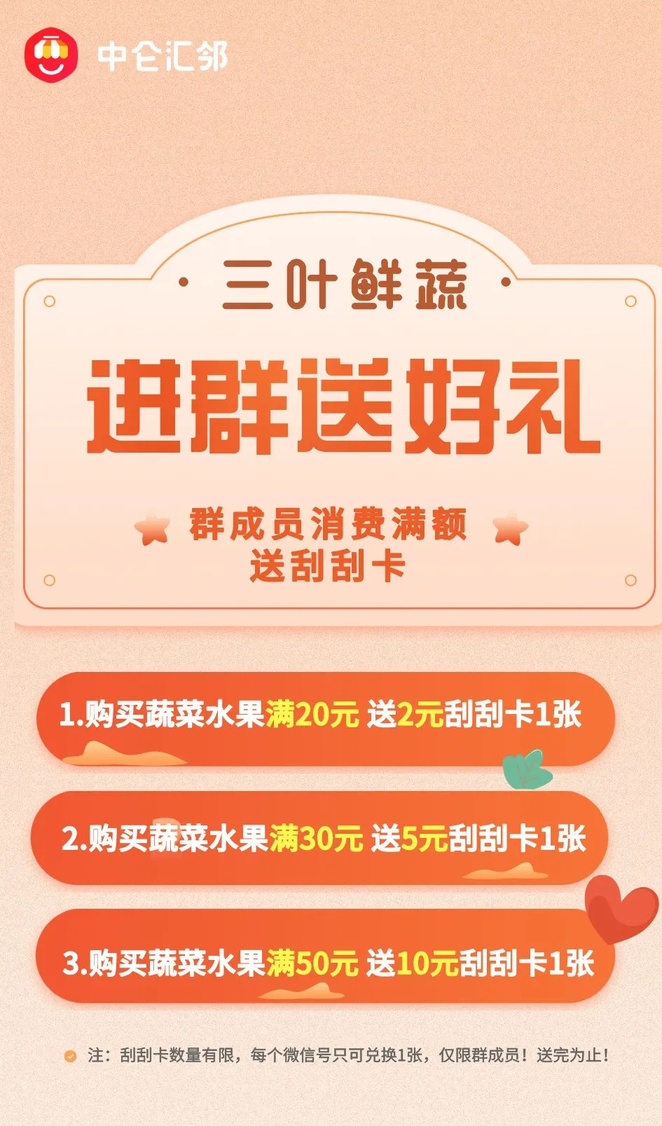 最后一個環節就是營銷增收,三葉鮮蔬采用滿減的營銷策略,使用中侖團隊免費提供的海報設計服務,掃碼進群消費滿額送刮刮卡,滿20元就送2元刮刮卡1張,真金白銀,客戶參與的積極性高漲,幾百張的刮刮卡,3天就全部送完了!