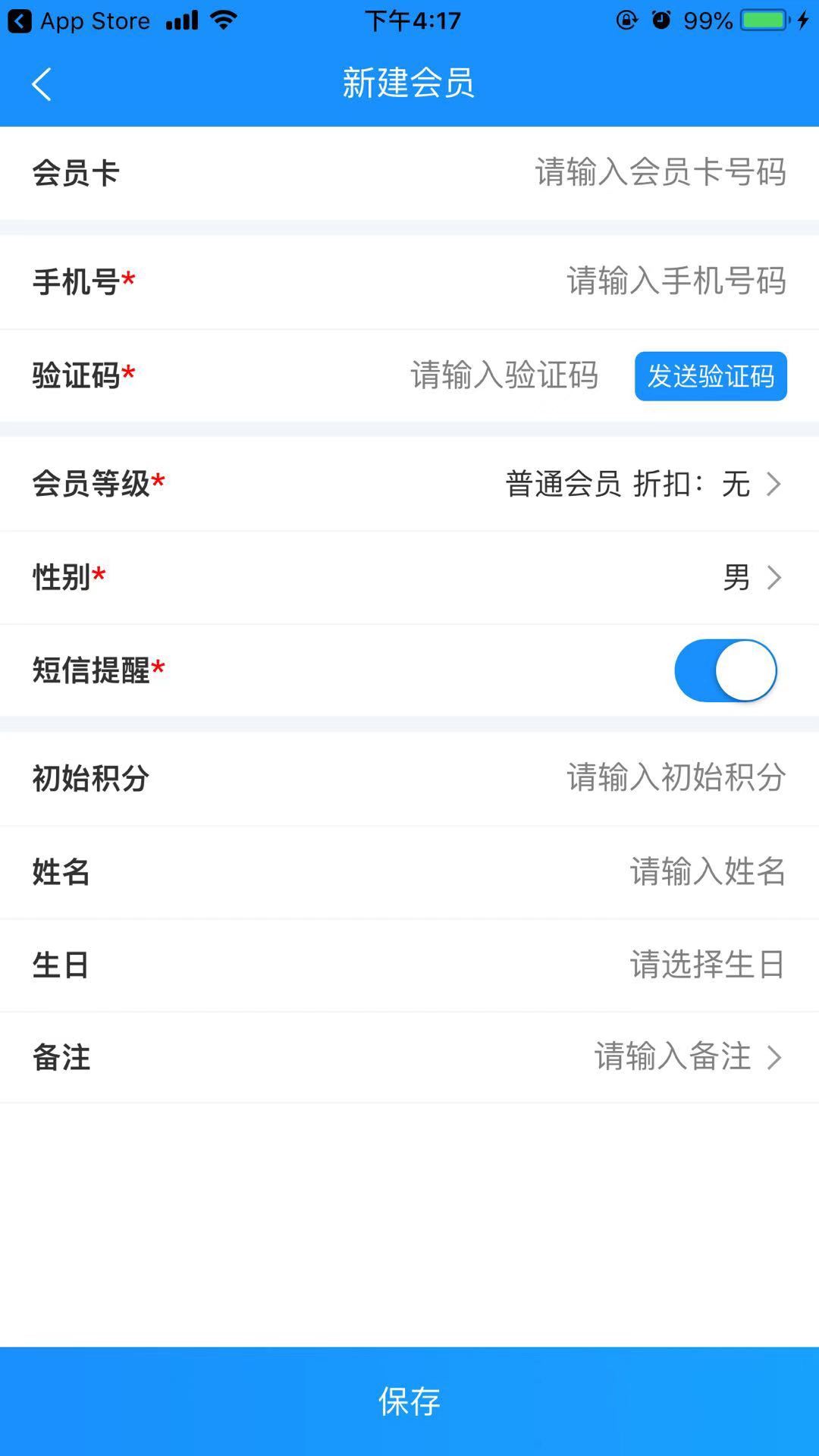 會員是門店一個重要的資產(chǎn),如果遇上門店會員辦理人數(shù)較多時,服務(wù)人員就可以用中侖掌柜手機收銀APP新建會員,輸入顧客手機號、短信驗證碼、會員等級、性別、短信提醒,幾步操作即可為門店新建一個會員,為后期會員營銷活動打下基礎(chǔ)。
