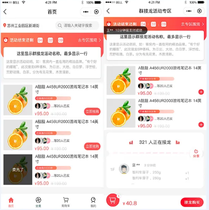 社群接龍是一個高效的社群營銷工具,商家發布接龍活動到群里,買家進行接龍購買。活動頁將對買家實時展示接龍情況。