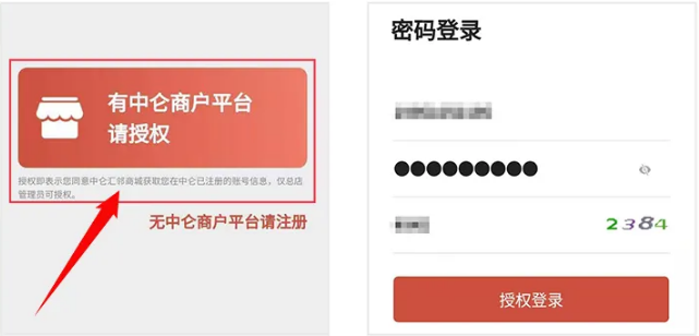 點(diǎn)擊【有中侖商戶平臺(tái)請(qǐng)授權(quán)】,輸入收銀系統(tǒng)賬號(hào)和密碼,選擇【授權(quán)登錄】