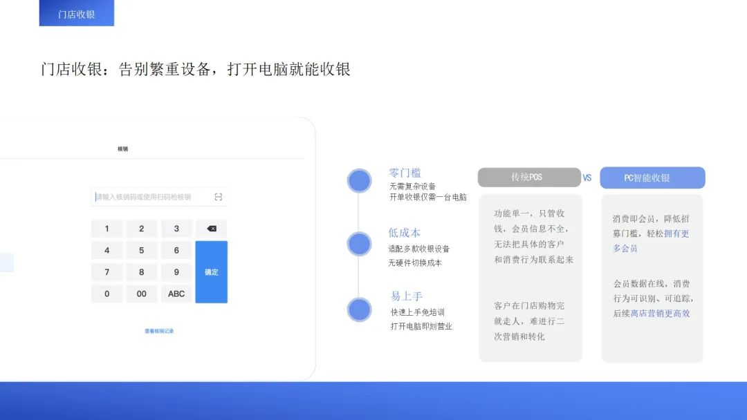 收銀方式多:多種收銀方式 、多設備無縫接 入、行業定制版收銀臺、多種到店營銷