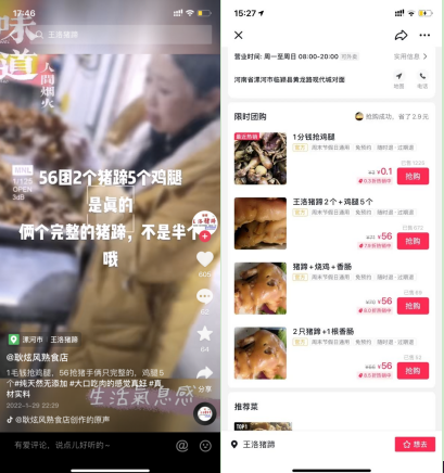 2、抖音團購:開店之初,中侖匯鄰就幫助王洛豬蹄全面布局短視頻和線上團購渠道,以往消費者根據美團商家提供的商品圖片下單,而抖音團購則是通過商品視頻和圖片相結合的方式吸引消費者。