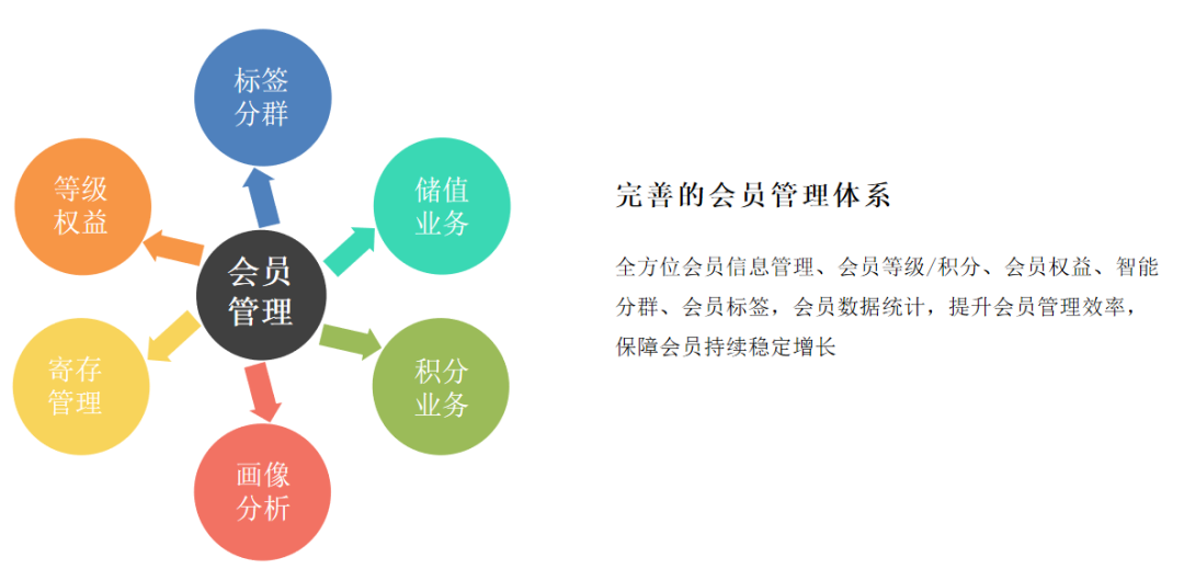 銀響力店鋪會員系統最底層是收銀系統支撐:前端產品由微信小程序、收銀機等作為入口;后臺系統是會員營銷平臺+標簽系統,對會員進行精細化打標、分層;同時還有第三平臺的配合,如微信、支付寶等。