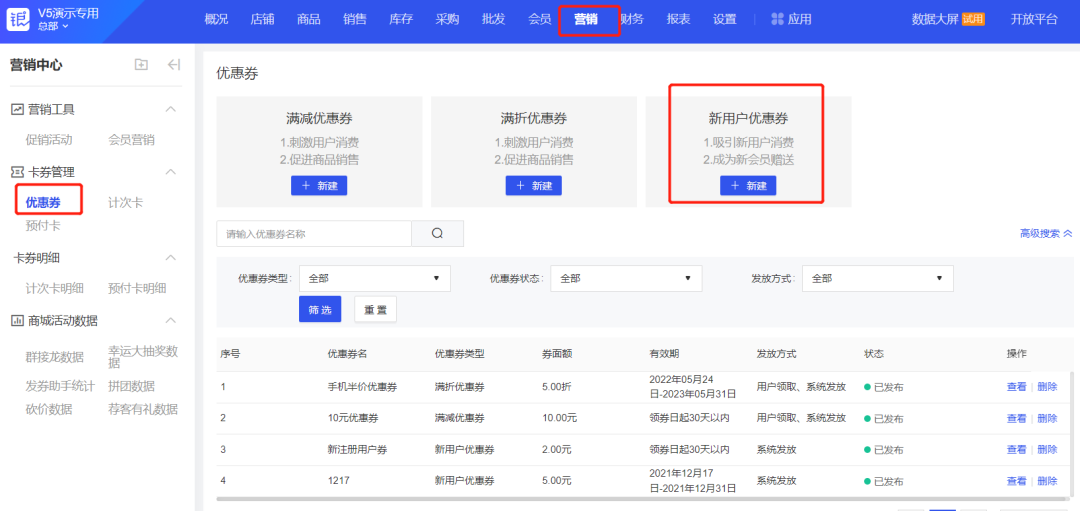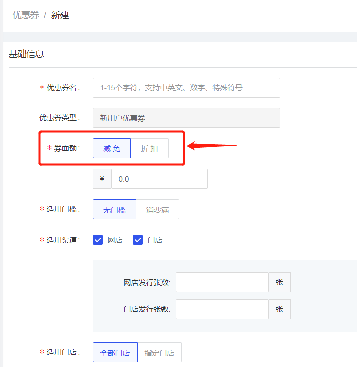商家可以在銀響力后臺創建【新用戶優惠券】、【薦客有禮】等優惠活動,選擇優惠券的彈窗,會出現減免券和折扣券。