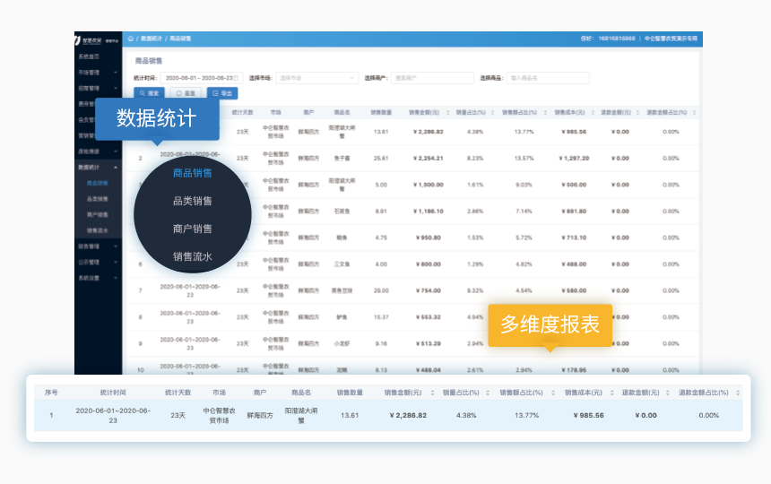 通過中侖農貿系統,可以很方便的查看商品、品類、訂單等多維度數據報表,經營情況隨時掌握,并且通過多維數據分析,改善菜場經營。