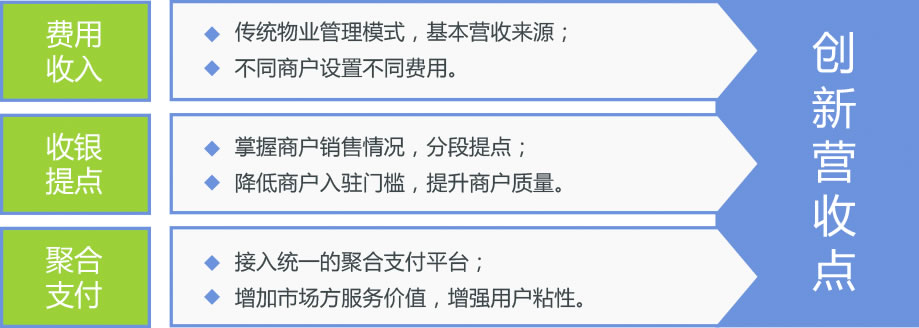 農貿市場不斷發展變革,客戶購買環境不斷優化升級,在新農貿的大背景下,市場方經營策略不斷革新,除傳統物業管理模式外,有了更多選擇。一方面,通過系統智能管理,降低市場經營成本,提高效率;另一方面,加強對市場經營的參與,統一管理收銀,把握市場經營關鍵數據。